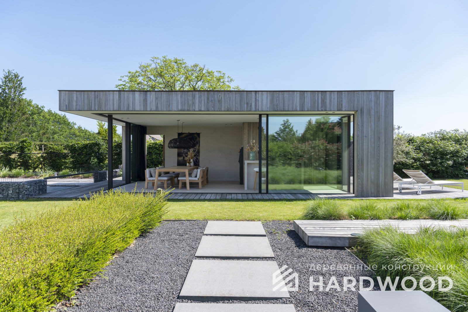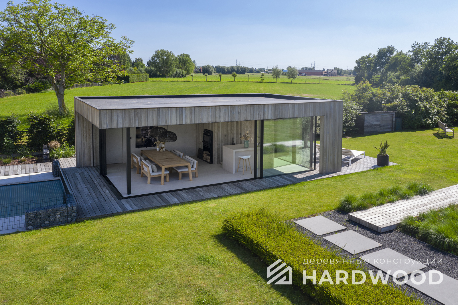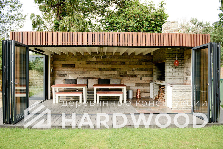 Полуоткрытая — золотая середина: экраны от ветра, продуманная геометрия кровли, удобная посадка на 8–12 персон. Подходит для барбекю и компактных печных комплексов.