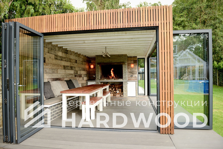 В закрытых вариантах закладываем остекление, которое можно открывать летом: безрамное, панорамное или раздвижные системы. Чем легче управлять створками и потоком воздуха, тем реже вы вспоминаете про дым.